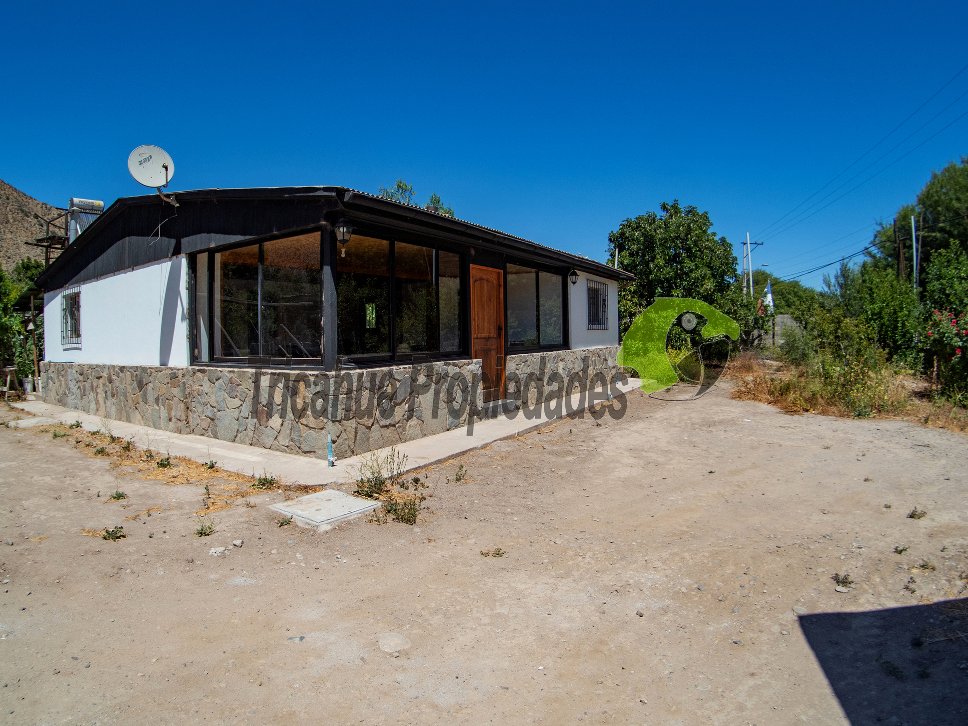 – La casa principal es de 100 m2 (regularizada), de 1 piso, 3 dormitorios, 1 baño. Cocina amoblada y equipada. Amplio living comedor. Construida de albañilería, muros con base de mampostería, pisos cerámicos, cielos de madera, muy luminosa gracias a sus amplios ventanales, puertas de pino oregón.